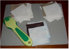 Le bloc devant faire 9", chaque carré doit donc mesurer 2"1/4. Pour les obtenir, on ajoute 7/8" et on coupe donc des carrés de 3"1/8