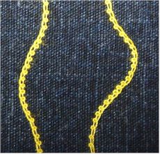 Sur l'essai ci-contre, voici les fils utilisés. Pour les trois essais le fil de canette est du polyester Gütermann et le fil de dessus du Madeira Aerofil 120 (couleur assortie en focntion du fil de décoration).